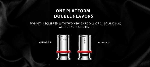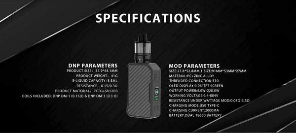 The MVP Box Mod with the DNP Pod Tank, expected as powerful combination and a newbie-friendly, affordable and durable starter kit. It is a powerful starter kit that is powered by dual 18650 battery, and comes with 5-220W power range. MVP Kit supports Power/Voltage/Temp NI/Temp PI/Temp SS Mode, it is also designed with a 0.96 inch TFT display screen. Two DNP Coils are included: DnP DM-1 0.15ohm Coil and DnP DM-3 0.3ohm Coil. The DnP Pod Tank is easy to use for both novice and masters with simple operation. It has 5.5ml large e-liquid capacity, you can refill it from bottom. It also features dual air intake holes & smooth airflow.