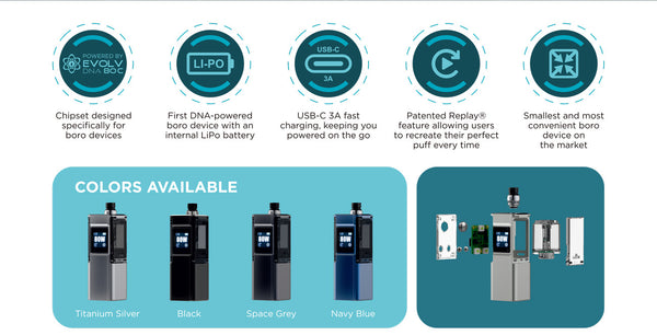 The LVE Boson DNA80C Boro AIO is a compact, all-in-one vape device with a built-in 2200mAh battery, supporting up to 80W output. Powered by the Evolv DNA80C chipset, it offers precise temperature control and a Replay feature for consistent vaping. The device supports 3A USB-C fast charging, features a 0.85-inch color display for easy navigation, and has a durable PVD-coated body available in four colors. Its 510 drip tip allows for tool-free adjustments, combining portability with high performance.