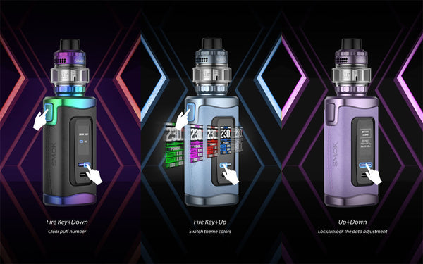 Smok MOK Morph 3 Kit is powered by dual 18650 batteries(not included),5-230W output range, the leather decoration at the side helps ergonomic hold. The box mod has 32.2mm across the area.Smok MOK Morph 3 is compatible with 5ml T-Air tank, and has dense vapor production via TA Series meshed coils.The T-Air tank measures 30mm in diameter. Accommodating 5ml of freebase and nic salts, it purchases huge clouds via both honeycomb airflow and the TA meshed coil.