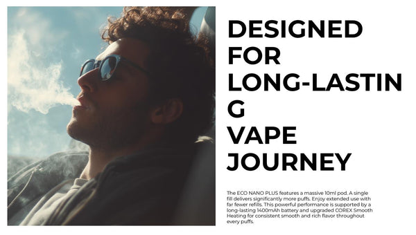 Powered by COREX Smooth Heating Technology, the Eco Nano Plus guarantees consistent vapor production, rich flavor, and smooth throat hits with every puff. The upgraded 0.6ohm Lush Mesh Pod ensures superior heating stability and a longer coil lifespan, lasting up to 4 refills per pod.