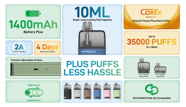 The Vaporesso Eco Nano Plus Pod System Kit delivers a perfect balance of endurance, simplicity, and performance. Featuring a massive 10ml refillable pod and a powerful 1400mAh built-in battery, it ensures up to 35,000 puffs on a single pod—minimizing refills while maximizing satisfaction.