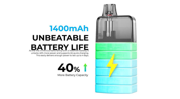 Supporting 2A Type-C fast charging, the device recharges quickly and can last up to 4 days of continuous vaping. Compact and sleek, the Eco Nano Plus is designed for vapers who want reliable performance and convenience in one stylish device.