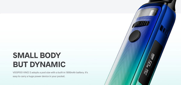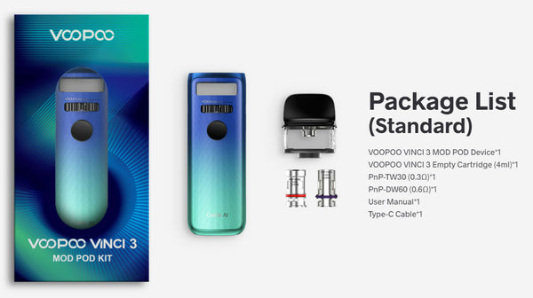 The Voopoo VINCI 3 Mod Pod System, offering an internal 1800mAh battery, 5-50W output range, and uses some new additions to the PnP Coils Series. Constructed from durable zinc-alloy, the chassis of the Vinci 3 Mod Pod is lightweight and slim, making it extremely portable. Fitting neatly within the bookbag, purse, or pocket, the Vinci 3 does not sacrifice in the performance department, packing an 1800mAh battery inside the small chassis. Holding up to 4mL within the refillable pod, the Vinci 3 calls upon the host of PnP coils to deliver flavorful MTL vaping or large clouds of flavored vapor via DTL vaping. Visually striking and with function to match, this is the next pod system that will make its way into your collection.