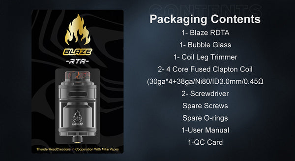 Thunderhead Creations Blaze RTA has a diameter of 26mm, offering a 2ml vape juice capacity and a 5.5ml bubble glass, coupled with its dual coil configuration and innovative "WOW" build...