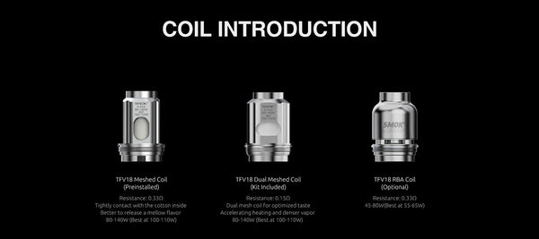 Those TFV18 Replacement Coil are perfectly compatible with Smok TFV18 Tank Atomizer 7.5ml. Brand: Smok Unit: 3pcs/pack Resistance: Meshed 0.33ohm, Dual Meshed 0.15ohm Package: Simple Packing