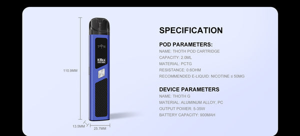 Introducing the latest addition to the THOTH series - THOTH G. Featuring a robust 900mAh battery and adjustable wattage ranging from 5 to 35W, this device offers both power and flexibility. The THOTH G is designed to be versatile, with pod cartridges and coils from the entire THOTH series being compatible. Combined with its precise adjustable airflow system, you can seamlessly transition from RDL to MTL vaping, ensuring a full and satisfying experience. Whether you prefer freebase or nicotine salt e-liquids, the THOTH G is ready to deliver.