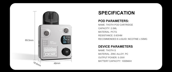 Introducing the latest addition to the THOTH series - the THOTH S. Boasting a powerful 1000mAh battery and adjustable wattage from 5 to 35W, this device offers unmatched power and flexibility. The THOTH S is designed for versatility, compatible with pod cartridges and coils from the entire THOTH series. With its precise adjustable airflow system, you can effortlessly switch between RDL and MTL vaping for a complete and satisfying experience. Whether you prefer freebase or nicotine salt e-liquids, the THOTH S is primed to deliver.