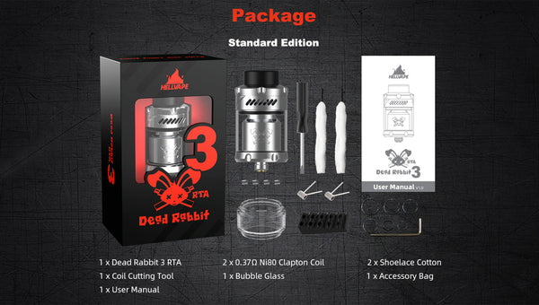 Hellvape Dead Rabbit 3 RTA features a diameter of 25mm. Finished with a postless deck for dual coil configuration, incorporating a 3.5ml vape juice capacity, you can also choose a...