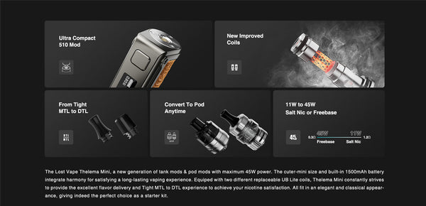 The Lost Vape Thelema Mini 45W Kit, a new generation of tank mods & pod mods with maximum 45W power. The cuter-mini size and built-in 1500mAh battery integrate harmony for satisfying a long-lasting vaping experience. Equiped with two different replaceable UB Lite coils, Thelema Mini constantly strives to provide the excellent flavor delivery and Tight MTL to DTL experience to achieve your nicotine satisfaction. All fit in an elegant and classical appearance, giving indeed the perfect choice as a starter kit.