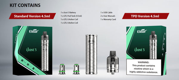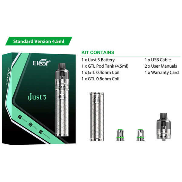 Eleaf iJust 3 Starter Kit, It is made of the unique metallic material, which looks much more elegant and charming. And the iJust 3 is powered by an internal 3000mAh battery. It supports a direct output for a stable performance. It can also be charged via a lateral USB port. The four-color LED lights indicates the battery life clearly. The Eleaf GTL Pod Tank comes with 2ml and 4.5ml juice capacity for MTL or DTL vape. The Eleaf GTL Pod Tank is not merely a pod cartridge, but a 510-thread tank. The Eleaf GTL Pod Tank is compatible with Eleaf GTL Coils. The Eleaf GTL Pod Tank adopts replaceable coil system. .