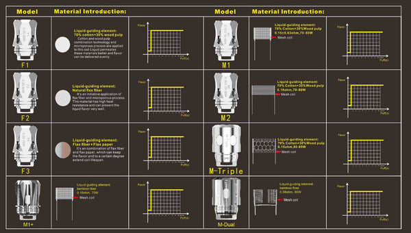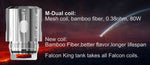 the M1 Falcon Coil is rated at 0.15-ohms of resistance, while the M2 coil is rated at 0.16-ohms. Both utilize mesh coils to better facilitate the extraordinary power going through them. The M1 and M2s liquid guiding elements use a 70% cotton and 30% wood-pulp mixture.