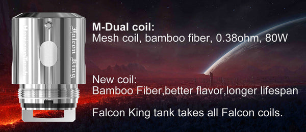 Those M-Dual coil 0.38ohm, M1+ coil 0.16ohm are perfectly compatible with Horizon Falcon King Tank. The F1 and F2 Horizon Falcon Replacement Coils are both rated 0.2-ohms, and both utilize...