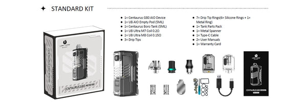 the Lost Vape Centaurus G80 AIO Pod Mod Kit, which features a 5-80W output range, a durable zinc and aluminum chassis, and a 5ml capacity in the Centaurus Boro Tank....