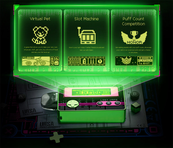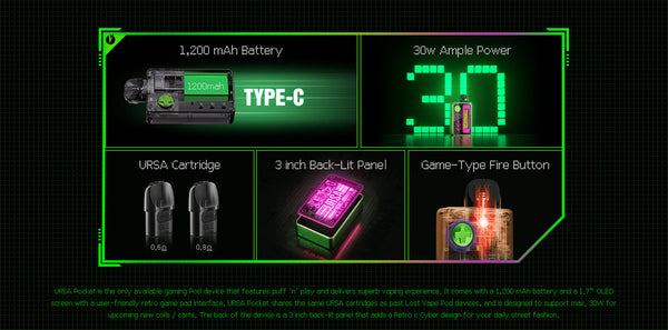 the lostvape URSA Pocket is the only available gaming Pod device that features puff play and delivers superb vaping experience. It comes with a 1200mAh battery and a 1.7inch OLED screen with a user-friendly retro game pad nterface. URSA Pocket shares the same URSA cartridges as past Lost vape pod devices , and is designed to support max 30W for. upcoming new coils. The back of the device is a 3 inch back-it panel that adds a Retro x Cyber design for your daily street fashion.