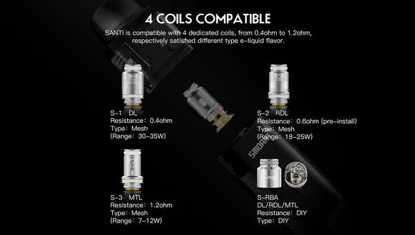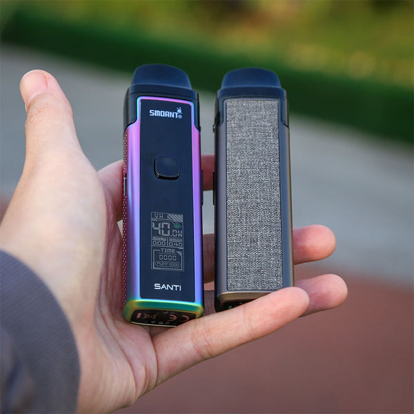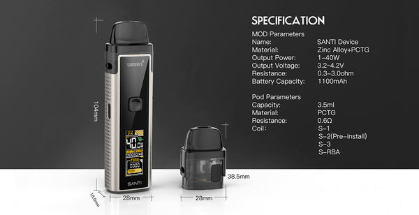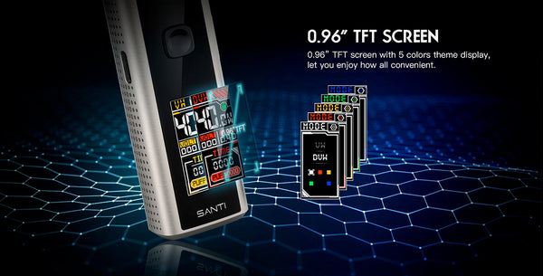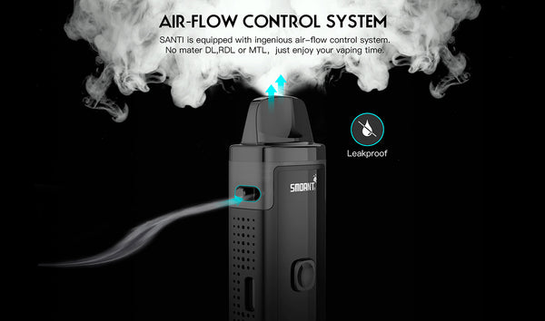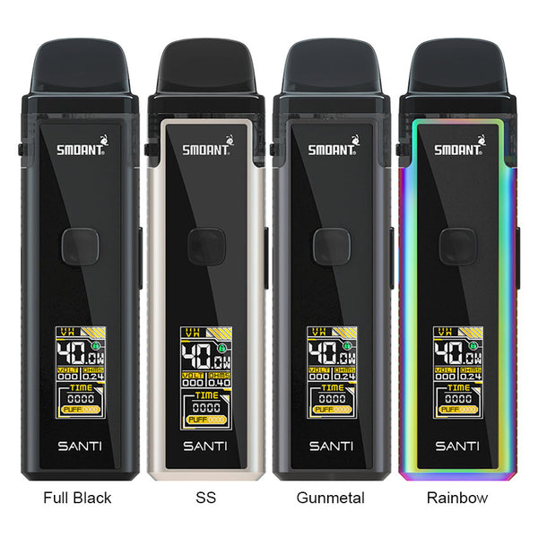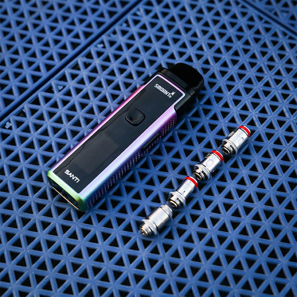 Smoant Santi Pod Starter Kit is a pod mod kit that built with 1100mAh battery capacity. It can be charged with type-c charging port and comes with a 0.96 inch TFT screen. A silicone check valve is designed to avoid e-liquid leakage and make the filling cleaner. to avoid the e-liquid leakage and keep the device clean. The pod has 3.5ml e-juice capacity and features easy Site filling system. You can enjoy DTL and MTL vaping freely with the adjusrment airflow system, Santi adopts two types of coil: 0.6ohm Ka1 MESH Coil for smooth airflow and original flavor, 0.8 4ohm Coil for rich flavor and better smell(S1 DL 0.4ohm, S2 RDL 0.6ohm, S3 MTL 1.2ohm.)it will provide you MTL or RDL or DL vaping with dense clouds and smooth taste,you will fall in love with it.