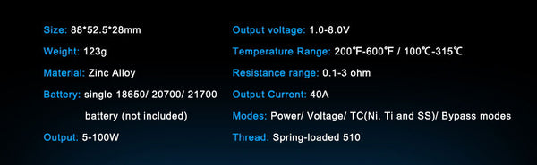 The Steam Crave Hadron Lite SBS 100W Kit, featuring a 1-100W range, extensive temperature control suite, and a single high-amp 18650 battery. Constructed from durable zinc-alloy, the chassis of the HADRON Lite SBS Mod delivers a visually striking form factor and maintaining a smaller profile. Utilizing a single 18650 battery, the battery is installed at the bottom behind a threaded cap.