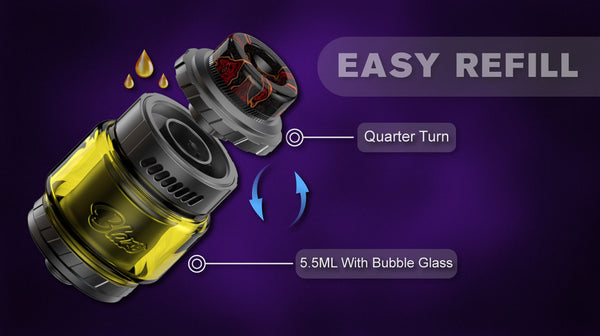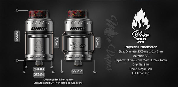 Here comes a single coil version of Blaze RTA - Blaze SOLO RTA,It comes with an upgraded "W" postless build deck, there are 14pcs Honeycomb Side Airflow & Slotted Bottom Airflow surrounded, which brings you maximum flavor. Moreover, the brand new quarter turn refill design for excellent user experience. The top to bottom airflow design ensures 100% leak-proof, whatever you are a beginner or advanced user. Plus, there is a 5.5ml bubble glass included to meet your huge capacity needs.25mm diameter.