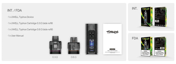 The Uwell Typhos Pod System Kit delivers high performance in a stylish, compact form. Powered by a 2000mAh battery and supporting up to 45W output, the Typhos is optimized for both RDL and MTL vaping. It features a spacious 6ml top-fill pod, dual output modes (Wave/Storm), and a vibrant 1.05" HD screen for real-time control. With CoreShield leak-proof tech, precision airflow adjustment, and long coil lifespan, this kit is perfect for vapers seeking a versatile and leak-resistant experience.
