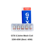 Resistance: GTX 0.2ohm Mesh (NiCr,45 - 60W,DTL), GTX 0.3ohm Mesh (NiCr,32 - 45W,DTL)