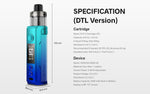 Cartridge: The standard cartridge for DRAG S2 DTL version is PnP X Cartridge DTL and the compatible coil resistance is 0.2ohm and 0.3ohm. The standard coils are PnP X 0.2ohm and PnP X 0.3ohm. It is recommended to choose the e-liquid with 50%-70% VG and whose nicotine content of no more than 35 mg. For the DRAG S2 MTL version (Only For Italy, France and Germany), the standard cartridge is PnP X Cartridge MTL with PnP X 510 DTL Drip Tip(Pre-installed) and PnP X 510 MTL Drip Tip(Replaceable) ( the wider one for DTL, the narrower and longer one for MTL and RDL) and the compatible resistance is 0.3ohm and 0.6ohm. The standard coils are PnP X 0.3ohm / PnP X 0.6ohm. It is recommended to choose the e-liquid with 50% VG and whose nicotine content of no more than 35 mg.