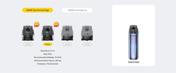 All the VMATE Pod Family devices are currently compatible with VMATE Top Fill Cartridge 0.7ohm. VMATE Top Fill Cartridge 0.4ohm is currently only available for VMATE MAX.